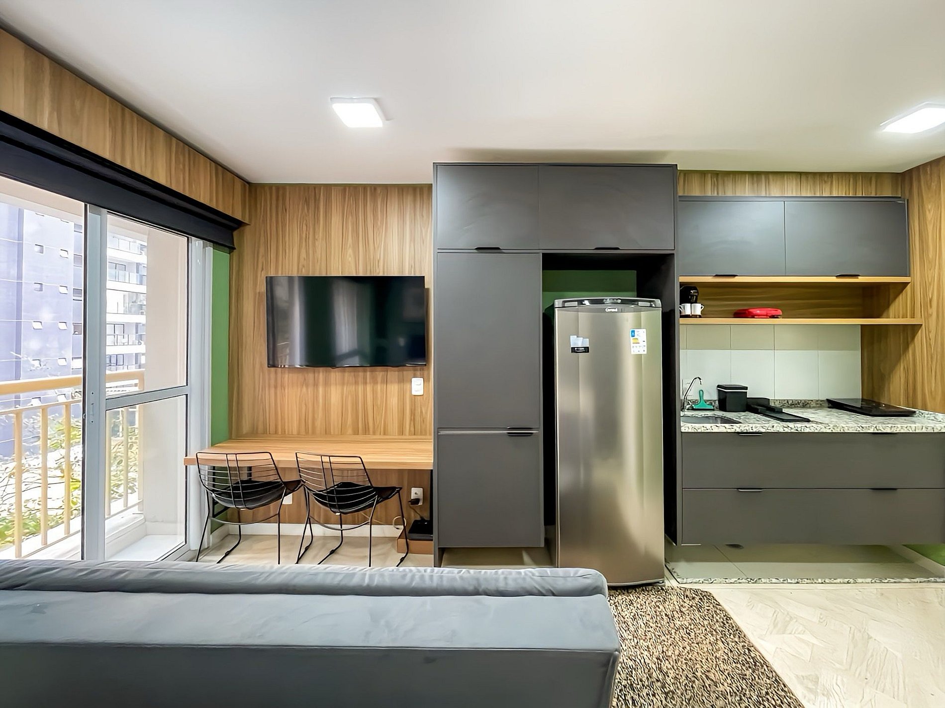 Cozy studio, renovated and equipped with a kitchenette, complete linen, smart TV and excellent Wi-Fi connection for home office. Excellent option for 3 people