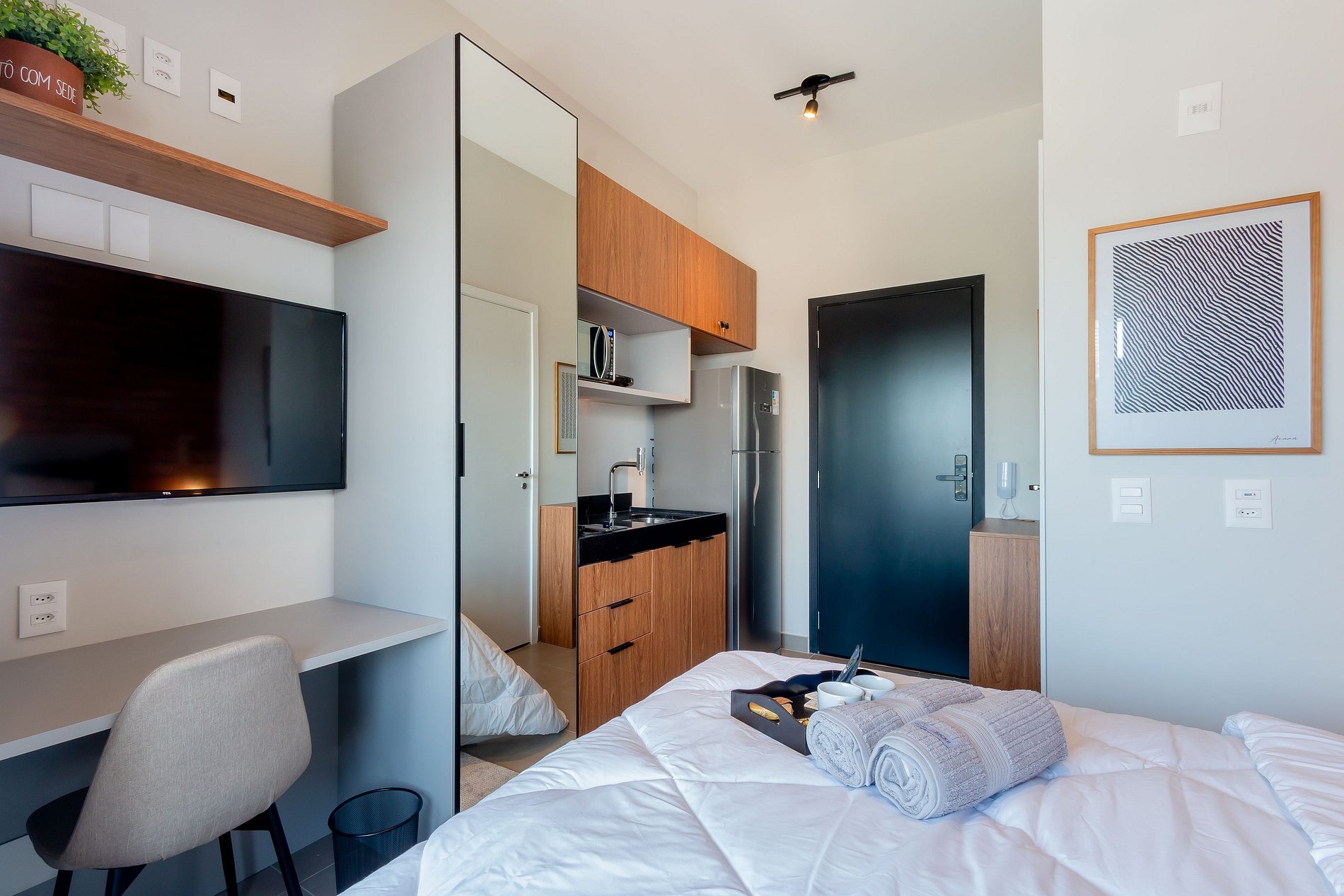 The Studio has a double bed, bathroom, work desk, kitchen, 43" TV with Netflix and balcony with a beautiful view of the city. We have all the basic utensils to make your stay more comfortable.