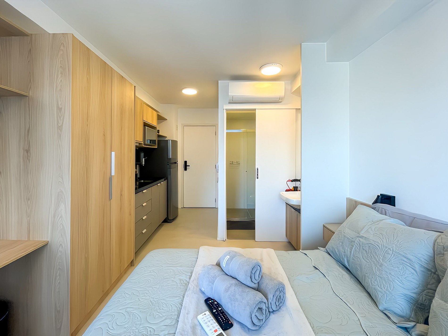 Modern, comfortable apartment thoughtfully decorated to provide an exceptional accommodation experience. The space features a cozy bed with fresh linens, air conditioning, plenty of natural light, and a private balcony with a city view. Enjoy a compact kitchen equipped with a mini fridge and microwave, ideal for quick meals, along with a dedicated area for work or study. This practical and welcoming environment is perfect for both leisure and business stays in a prime city location.