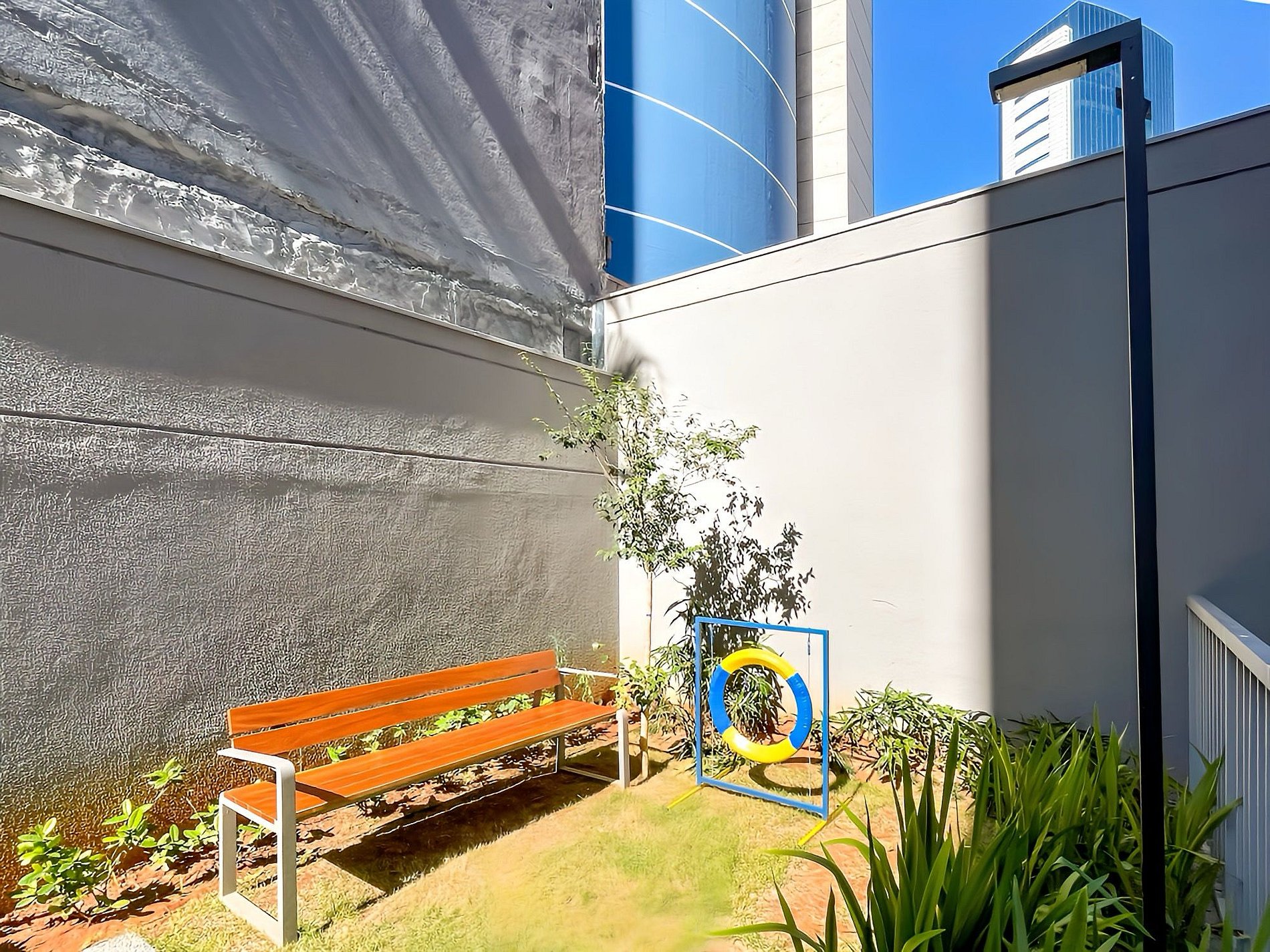 El condominio ofrece apartamentos de 1 dormitorio con balcón, ideales tanto para estancias cortas como largas. Entre sus servicios de alta gama se incluyen una impresionante piscina, salón de fiestas, gimnasio totalmente equipado para quienes deseen mantener una rutina activa, espacio para guardar bicicletas y lavandería en el edificio.