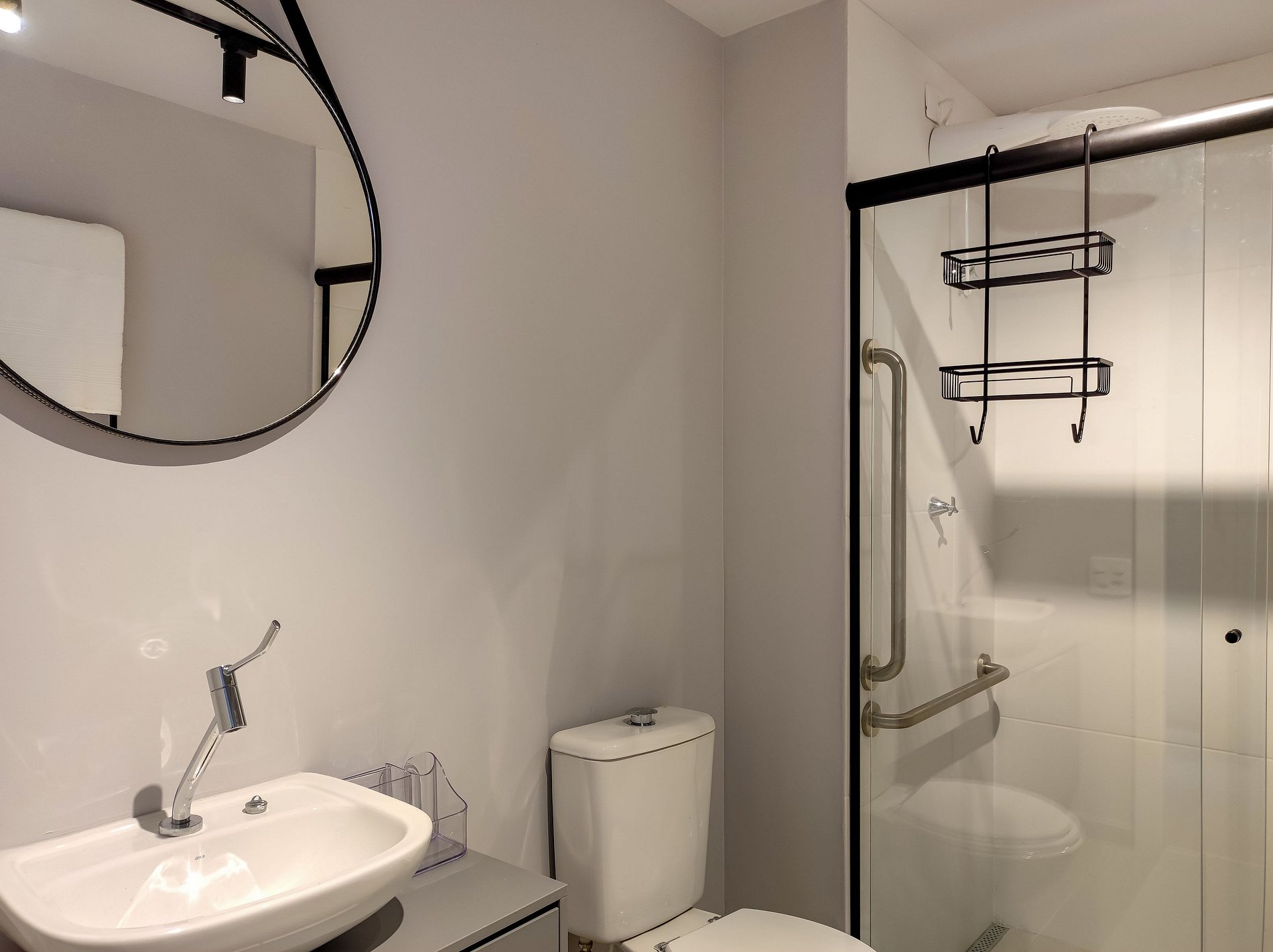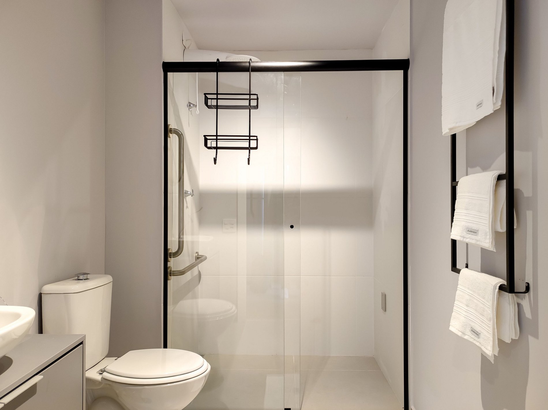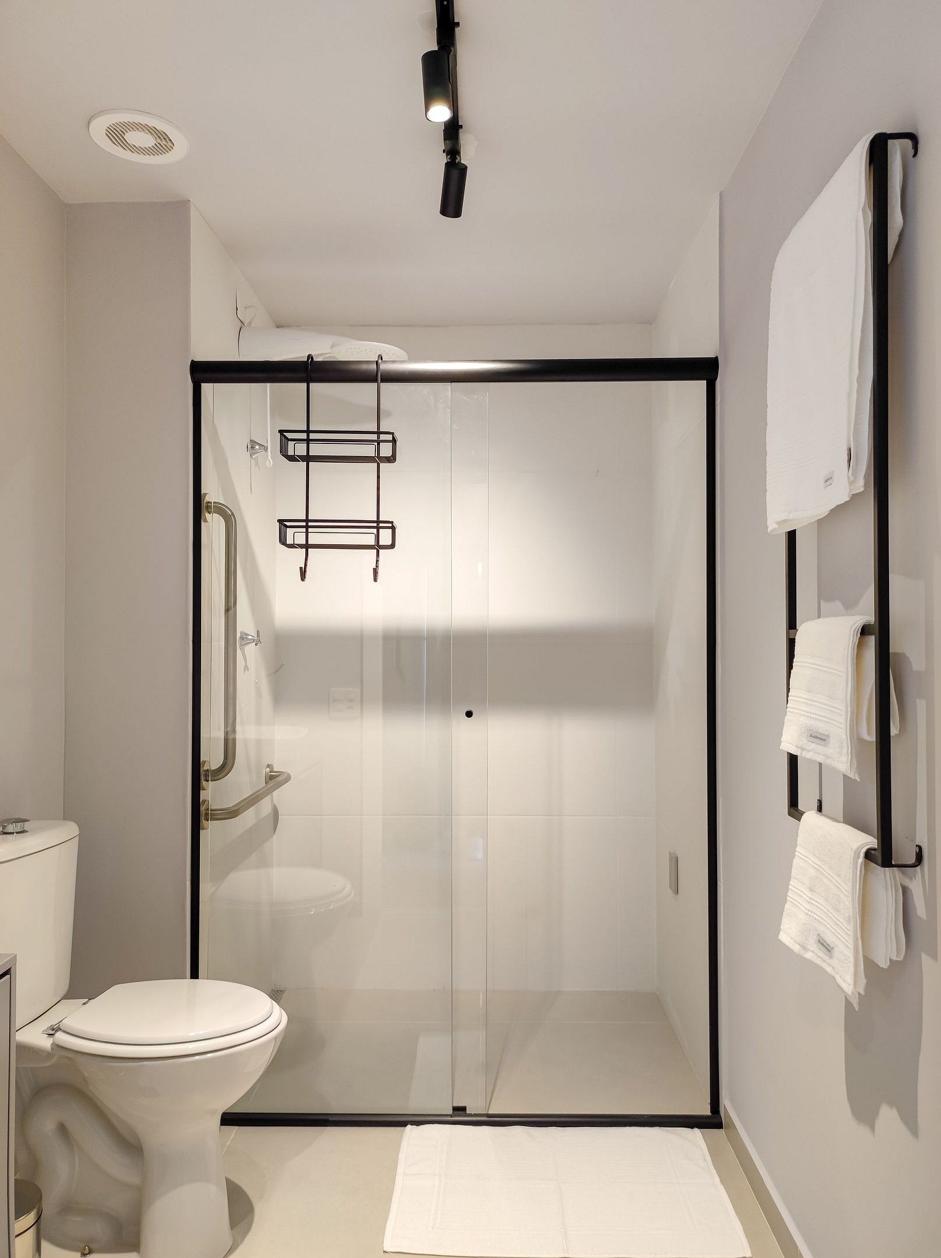 Baño moderno: con ducha de alta presión, toallas y productos de higiene esenciales.