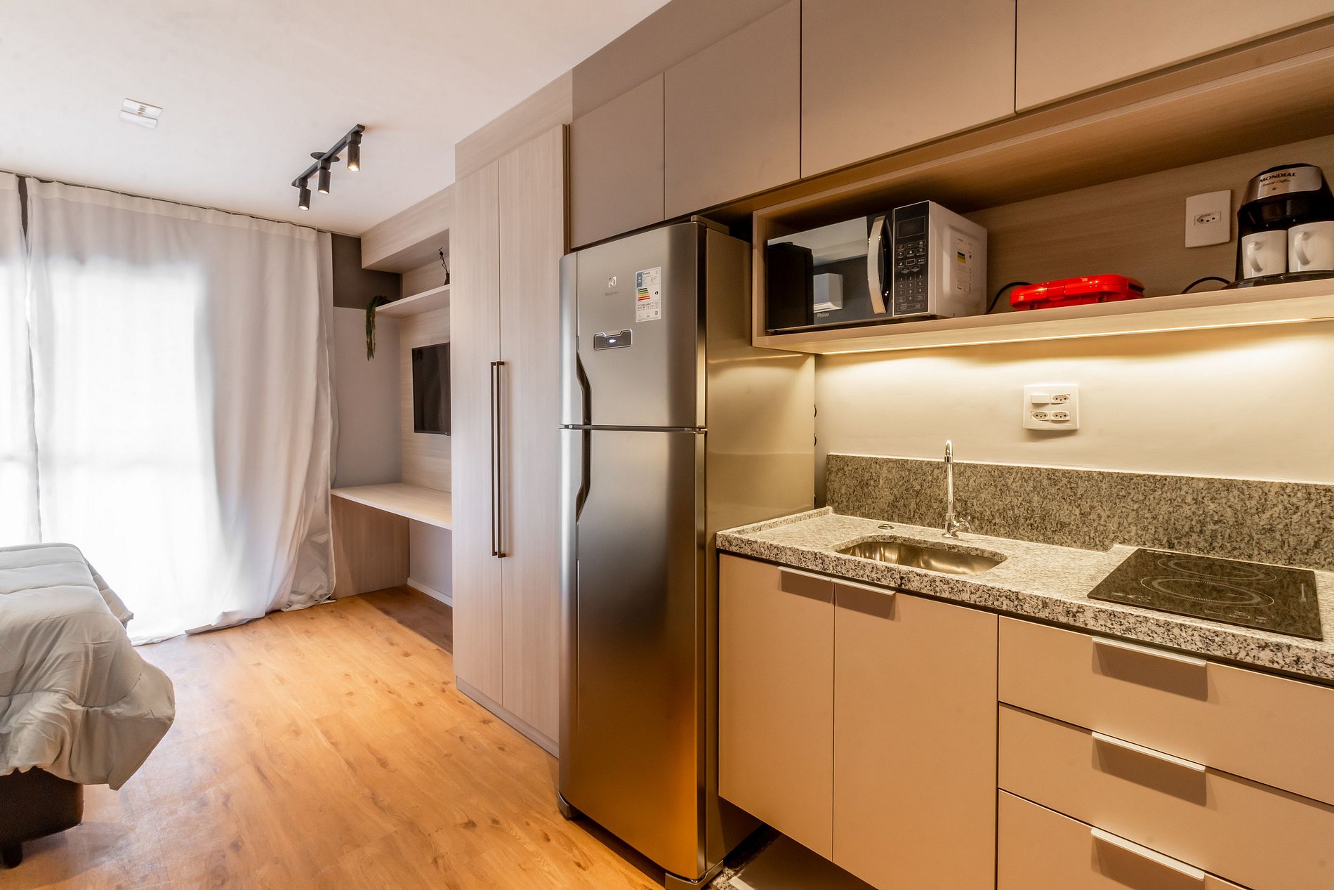 Recientemente renovado, el estudio My One Bela Vista combina funcionalidad y estilo. Equipada con una cama doble, baño privado, escritorio y cocina completa, el ambiente es perfecto para tus necesidades.