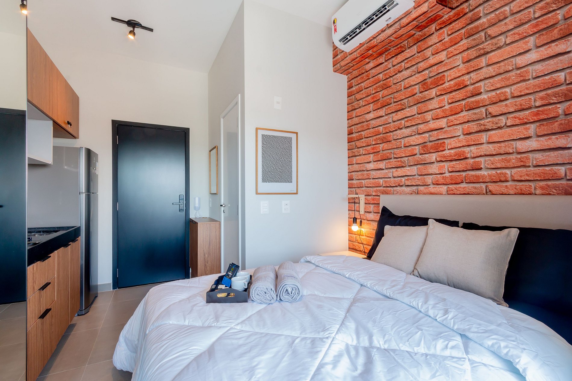 Estúdio novo e contemporâneo, com tudo que você precisa: utensílios básicos, enxoval e Wi-Fi. O prédio oferece piscina, academia, coworking e lavanderia. Garagem disponível mediante aviso prévio no condomínio.