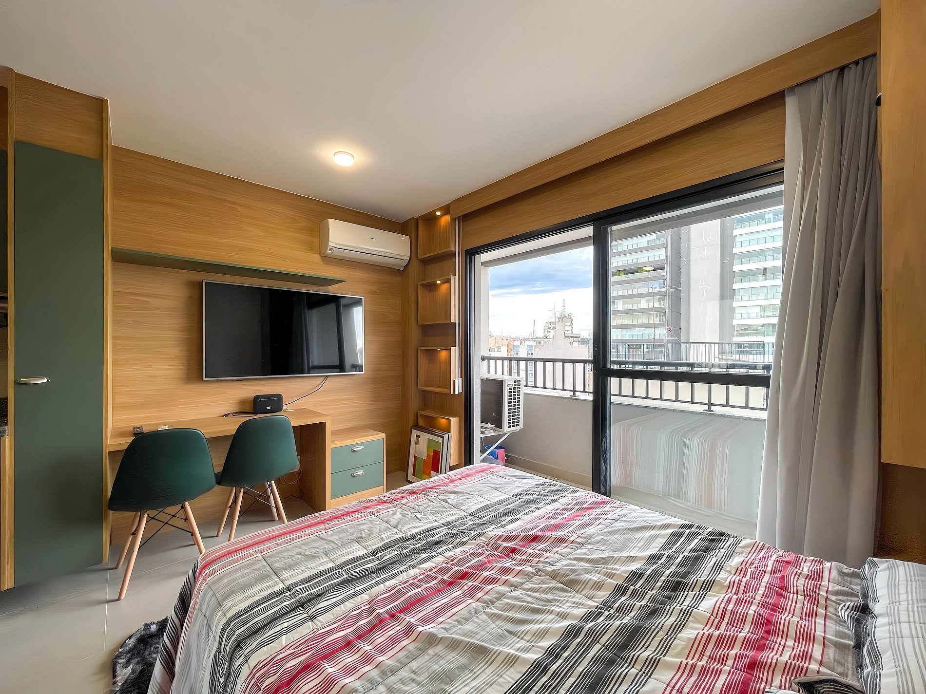 O apartamento no Today Pinheiros foi projetado para até 2 pessoas e possui aproximadamente 25 m². O espaço combina funcionalidade e estilo, contando com uma cozinha equipada, cama confortável e uma decoração contemporânea. Sua varanda adiciona um charme especial, perfeita para relaxar após um dia agitado. O ambiente é ideal para estadias curtas ou longas, oferecendo privacidade, conforto e todas as facilidades necessárias.