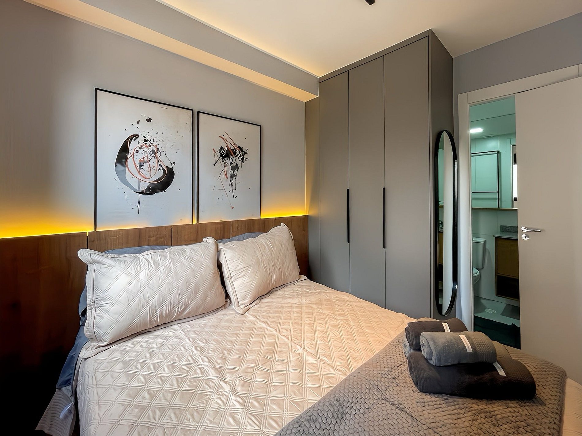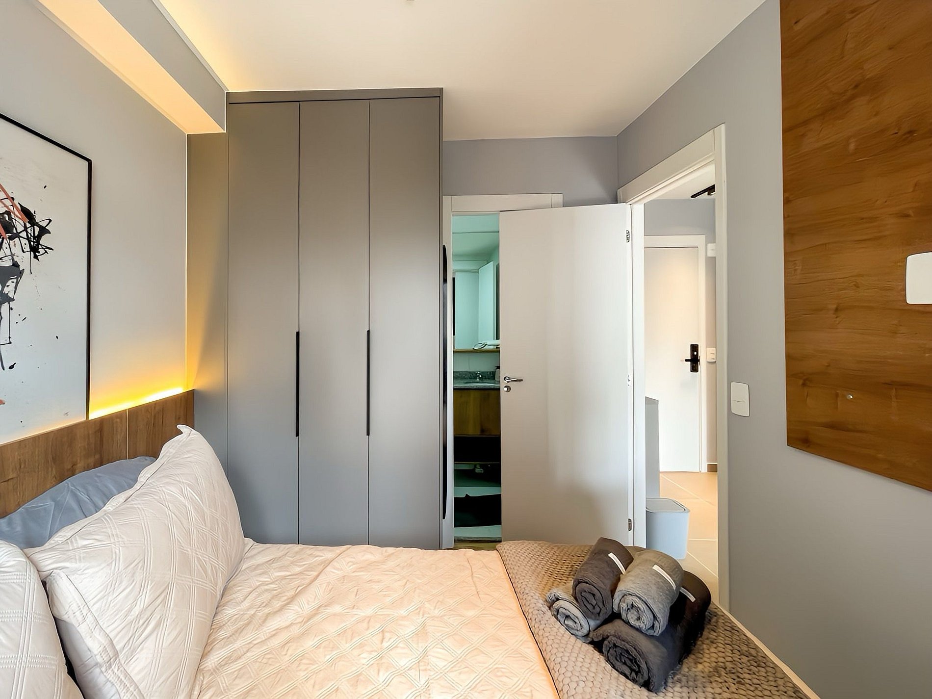 O condomínio oferece apartamentos com 1 ou 2 quartos com varanda, sendo ideais tanto para estadias curtas quanto longas. Comodidades de alto padrão que incluem uma deslumbrante piscina com deck molhado, salão de jogos, academia completa e área fit para os que gostam de manter uma rotina ativa, bicicletário, praça churrasqueira e solário